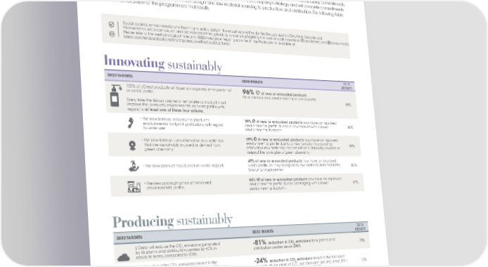 SHARING BEAUTY WITH ALL 2020 RESULTS The year 2020 marks the end of the Sharing Beauty with All programme, the Group’s first generation of sustainability commitments, established in 2013. This programme placed sustainability at the heart of the company’s strategy, and set concrete commitments to achieve by the end of 2020, from product design and raw material sourcing to production and distribution. The following table provides an overview of the programme’s final results. Social, societal, environmental and health and safety data in this report was verified by the Group’s auditors Deloitte & Associés and PricewaterhouseCoopers Audit, and are indicated throughout by symbols highlighting the level of audit assurance: (moderate) and (reasonable). Please refer to the methodological note and 2020 Assurance Report published in the ‘Publications’ available at: loreal.com/en/publications/sharing-beauty-with-all-publications/ Innovating sustainably 2020 TARGETS 2020 RESULTS 2019 RESULTS 100% of L’Oréal products will have an improved environmental 96% of new or renovated products or social profile. have an improved environmental or social profile. Every time the Group creates or renovates a product, it will 85% improve the product’s environmental or social profile with regard to at least one of these four criteria: • the new formula reduces the product’s 39% of new or renovated products now have an improved environmental footprint, particularly with regard environmental profile due to a new formula with a lower 46% to water use; environmental footprint. • the new formula uses renewable raw materials 69% of new or renovated products now have an improved that are sustainably sourced or derived from environmental profile due to a new formula incorporating 59% green chemistry; renewable raw materials that are either sustainably sourced or respect the principles of green chemistry. 49% of new or renovated products now have an improved • the new product has a positive social impact; social profile, as they incorporate raw materials from Solidarity 40% Sourcing programmes. • the new packaging has an improved 85% of new or renovated products now have an improved environmental profile. environmental profile due to packaging with a lower 67% environmental footprint. Producing sustainably 2020 TARGETS 2020 RESULTS 2019 RESULTS L’Oréal will reduce the CO emissions generated 2 -81% reduction in CO emissions from plants and by its plants and distribution centres by 60% in 2 - 78% absolute terms, compared to 2005. distribution centres since 2005. L’Oréal will cut the CO2 emissions linked to the -24% reduction in CO emissions linked to the transport transport of its products by 20% (in gram of CO per 2 2 of products (in gram of CO per sales unit per km) since 2011 - 12% sales unit per km), compared to 2011. 2 with 434,293 tonnes of CO2 emitted in 2020. L’Oréal will lower its water consumption by 60% -49% decrease in water consumption at plants - 51% per finished product, compared to 2005. and distribution centres since 2005 (in litre/finished product). L’Oréal will reduce its waste generation by 60% -37% reduction in waste generated from plants and - 35% per finished product, compared to 2005. distribution centres since 2005 (in gram per finished product). L’Oréal will send zero industrial waste to landfill. * The 0 waste to landfill goal (beyond regulatory requirements) for all factories and distribution centres was achieved in 2018. *Beyond local regulatory requirements and with the exception of food waste at two sites. 9