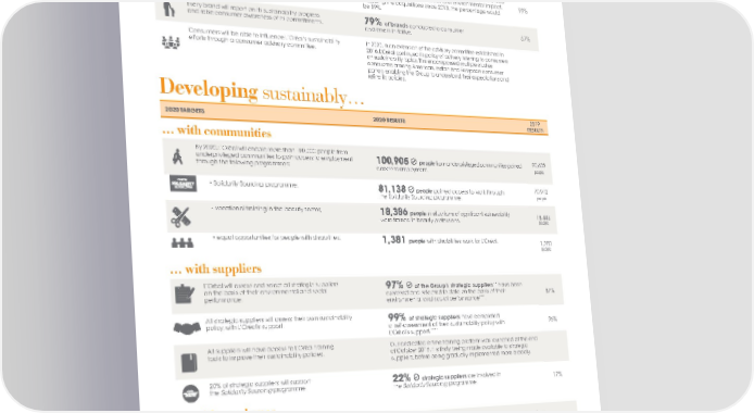 Living sustainably 2020 CLOSING REPORT 2020 TARGETS 2020 RESULTS 2019 RESULTS L’Oréal will evaluate the environmental and social 100% of new or renovated products in 2020 profile of all its products using an assessment tool. * All brands will make this information publicly available were assessed using our product assessment tool . to allow consumers to make sustainable choices. The indicator of the percentage of brands that communicate 100% information arising from the SPOT tool to consumers will be completed as soon as the social and environmental display system is finalised. The system is currently being developed and implemented. All brands will assess their environmental and social impact 100% of the international brands present in the Group and make commitments to improve it. in 2013 have assessed their social and environmental impact. 99% Including the acquisitions since 2013, the percentage would be 89%. Every brand will report on its sustainability progress 79% of brands conducted a consumer and raise consumer awareness of its commitments. awareness initiative. 57% Consumers will be able to influence L’Oréal’s sustainability In 2020, in an extension of the advisory committee established in efforts through a consumer advisory committee. 2016, L’Oréal continued its policy of actively listening to consumers on sustainability topics. This encompassed multiple studies conducted among American, Indian and European consumer panels, enabling the Group to understand their expectations and refine its policies. Innovating sustainablyDeveloping sustainably… 2020 TARGETS 2020 RESULTS 2019 2020 TARGETS2020 RESULTS2019 RESULTS RESULTS … with communities 100% of L’Oréal products will have an improved environmental96% of new or renovated products or social profile.have an improved environmental or social profile. 85% By 2020, L’Oréal will enable more than 100,000 people from Every time the Group creates or renovates a product, it will underprivileged communities to gain access to employment 100,905 people from underprivileged communities gained 90,635 improve the product’s environmental or social profile withthrough the following programmes: access to employment. people regard to at least one of these four criteria: • the new formula reduces the product’s39% of new or renovated products now have an improved • Solidarity Sourcing programme;81,138 people gained access to work through 70,912 environmental footprint, particularly with regardenvironmental profile due to a new formula with a lower 46%the Solidarity Sourcing programme. people to water use;environmental footprint. 69% of new or renovated products now have an improved • vocational training in the beauty sector; 18,386 people in situations of significant vulnerability 18,443 • the new formula uses renewable raw materialsenvironmental profile due to a new formula incorporating were trained in beauty professions. people that are sustainably sourced or derived fromrenewable raw materials that are either sustainably sourced or 59% green chemistry;respect the principles of green chemistry. • equal opportunities for people with disabilities. 1,381 people with disabilities work for L’Oréal. 1,280 49% of new or renovated products now have an improved people • the new product has a positive social impact;social profile, as they incorporate raw materials from Solidarity 40% Sourcing programmes.… with suppliers • the new packaging has an improved85% of new or renovated products now have an improved L’Oréal will assess and select all strategic suppliers environmental profile due to packaging with a lower 67% ** environmental profile. on the basis of their environmental and social 97% of the Group’s strategic suppliers have been environmental footprint. performance. assessed and selected to date on the basis of their 87% *** environmental and social performance . All strategic suppliers will assess their own sustainability 99% of strategic suppliers have completed policy, with L’Oréal’s support. a self-assessment of their sustainability policy with 96% **** Producingsustainably L’Oréal’s support. All suppliers will have access to L’Oréal training Our dedicated online training platform was launched at the end 2019 tools to improve their sustainability policies. of October 2016. It is firstly being made available to strategic 2020 TARGETS2020 RESULTSRESULTS suppliers, before being gradually implemented more broadly. L’Oréal will reduce the CO emissions generated 2-81% reduction in CO emissions from plants and 20% of strategic suppliers will support by its plants and distribution centres by 60% in2- 78%the Solidarity Sourcing programme. 22% strategic suppliers are involved in 17% absolute terms, compared to 2005.distribution centres since 2005. the Solidarity Sourcing programme. L’Oréal will cut the CO emissions linked to the 2-24% reduction in CO emissions linked to the transport … with employees transport of its products by 20% (in gram of CO per2 2of products (in gram of CO per sales unit per km) since 2011 - 12% sales unit per km), compared to 2011.2 with 434,293 tonnes of CO2 emitted in 2020.Employees will benefit from health cover that reflects 96% of the Group’s permanent employees benefit from best practice in their country of residence. health cover that reflects best practice in their country of 94% L’Oréal will lower its water consumption by 60%-49% decrease in water consumption at plants residence. per finished product, compared to 2005.and distribution centres since 2005 (in litre/finished product).- 51%Employees will benefit from financial protection in the 92% of the Group’s permanent employees have access event of a life-changing accident. to financial protection in the event of a life-changing accident 91% L’Oréal will reduce its waste generation by 60%-37% reduction in waste generated from plants and - 35% (death or permanent disability). per finished produc